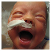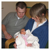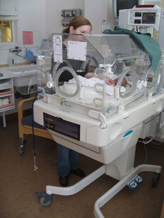 Sprutan mamma har fått fungerar inte så bra. Hon får mer och mer värkar. Doktorn kommer och kollar till mamma och ser att det är en vanlig förlossning på gång och det vill de ju inte eftersom jag är liten och för att jag ligger i säte. Sen går det undan jag kommer ut med akut kejsarsnitt. Mamma är bedövad med ryggmärksbedövning och lustgas. Klockan 03.16 kommer en Flicka Josefsson till världen. Väger 1670gram och är 41cm lång. Pappa är den första jag får hälsa på. När de sett att jag andas får jag även hälsa på mamma. Jag och pappa får fortsätta till ett annat rum för att kolla att jag mår bra medan mamma sys ihop. Efter en stund kommer mamma och jag får då ligga på hennes bröst. Mig lägger de i en kuvös och mamma och pappa åker in på sitt rum på förlossningen för att sova. När morgonen kommer får mamma och pappa en frukostbricka på sängen. Sen kommer de in och tittar till mig. Jag ligger där inne i min kuvös men jag får komma ut och ligga i mammas famn. Hon tycker nog att det ät svårt att veta hur hon ska hålla mig men jag är ju ganska liten och så har jag ju en massa sladdar på mig. |