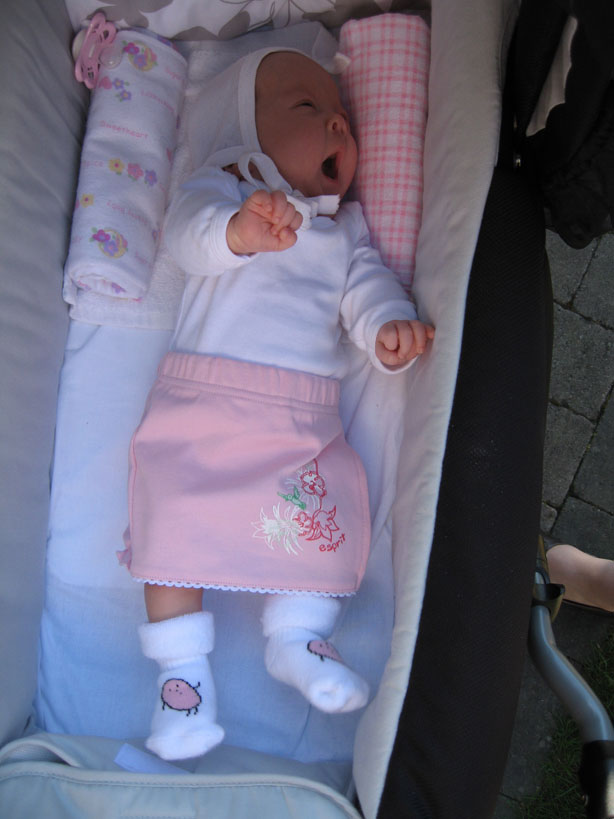 Efter gårdagens övning hade jag gått ner 15g. Sköterskorna sa att det inte är ovanligt att man går ner lite i vikt fösta gången man bara äter på mamma. Det är ju fortfarande trixigt hur man ska göra för att få i sig maten. Pappa har idag varit och hämtat min nya fina vagn. |