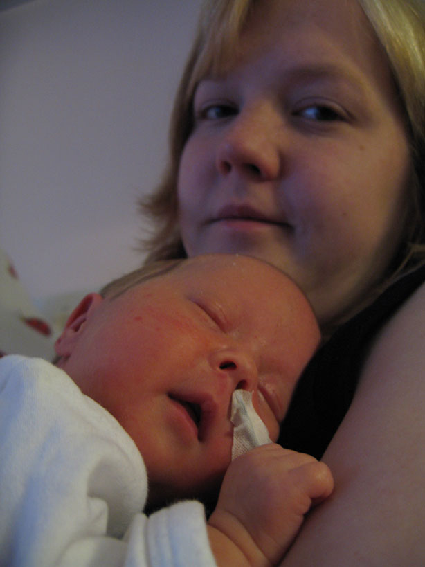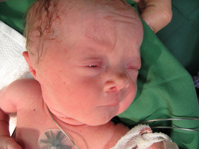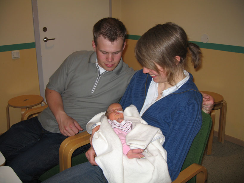 Sprutan mamma har fått fungerar inte så bra. Hon får mer och mer värkar. Doktorn kommer och kollar till mamma och ser att det är en vanlig förlossning på gång och det vill de ju inte eftersom jag är liten och för att jag ligger i säte. Sen går det undan jag kommer ut med akut kejsarsnitt. Mamma är bedövad med ryggmärksbedövning och lustgas. Klockan 03.16 kommer en Flicka Josefsson till världen. Väger 1670gram och är 41cm lång. Pappa är den första jag får hälsa på. När de sett att jag andas får jag även hälsa på mamma. Jag och pappa får fortsätta till ett annat rum för att kolla att jag mår bra medan mamma sys ihop. Efter en stund kommer mamma och jag får då ligga på hennes bröst. Mig lägger de i en kuvös och mamma och pappa åker in på sitt rum på förlossningen för att sova. När morgonen kommer får mamma och pappa en frukostbricka på sängen. Sen kommer de in och tittar till mig. Jag ligger där inne i min kuvös men jag får komma ut och ligga i mammas famn. Hon tycker nog att det ät svårt att veta hur hon ska hålla mig men jag är ju ganska liten och så har jag ju en massa sladdar på mig. |